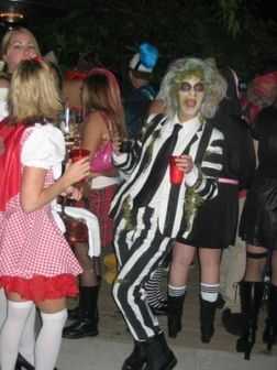 este es mi gran calabaza Halloween traje de 2011. Se compone de un marco de bambú en forma de T con bolsas de basura plástico que la cubre. Los brazos son postes de bambú cubiertos otra vez en bolsas de basura rota y las manos, guantes (troll) mi vec