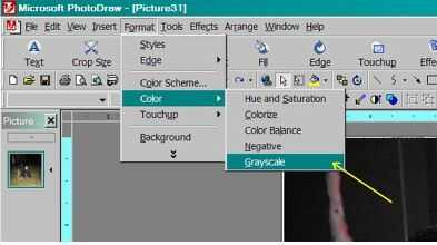 Abra el menú [formato], desplácese hacia abajo para abrir el submenú de [Color] y haga clic en [grises].  Esto abre el panel de color a la derecha de la pantalla y hacer disponible el botón de [grises].  Entonces, usted lo adivinó, haga clic en el botón [grises] en el panel derecho.