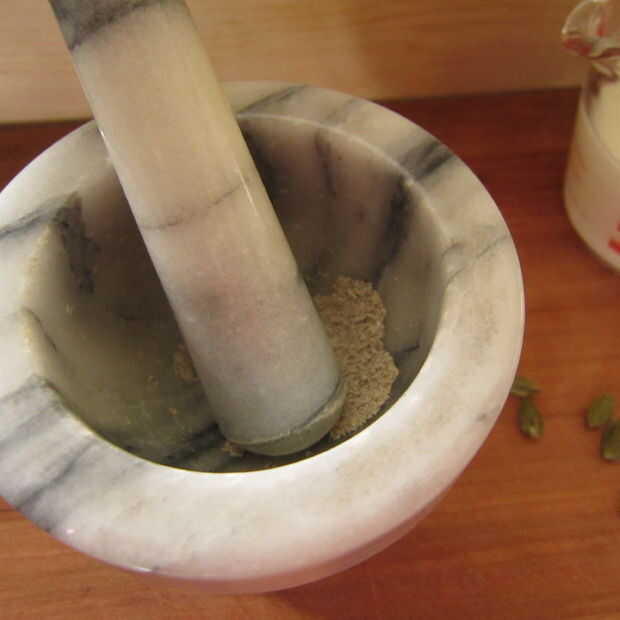 Cardamomo - puede utilizar tienda comprado tierra cardamomo pero si usted muele frescas obtendrá un sabor mucho más intenso. Romper las vainas verdes y vaciar las semillas en un mortero y una maja. Aplastar hasta que quede finamente molido.