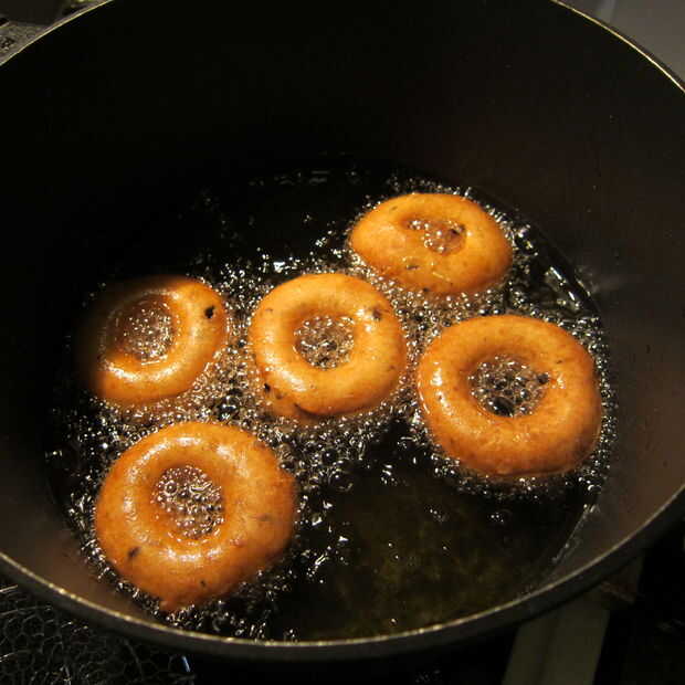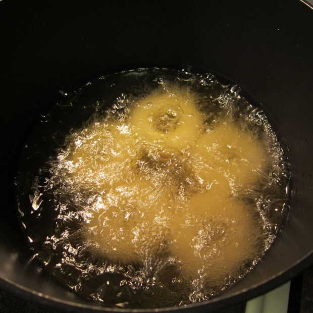 Una vez que el aceite se calienta a 360 grados F suavemente caída de rondas en el aceite por tandas de 3-5 dependiendo del tamaño de tu sartén. No la muchedumbre de los donuts! Apretadura caerá mucho la temperatura y la masa absorberá el aceite en lugar de cocinar al instante.