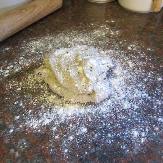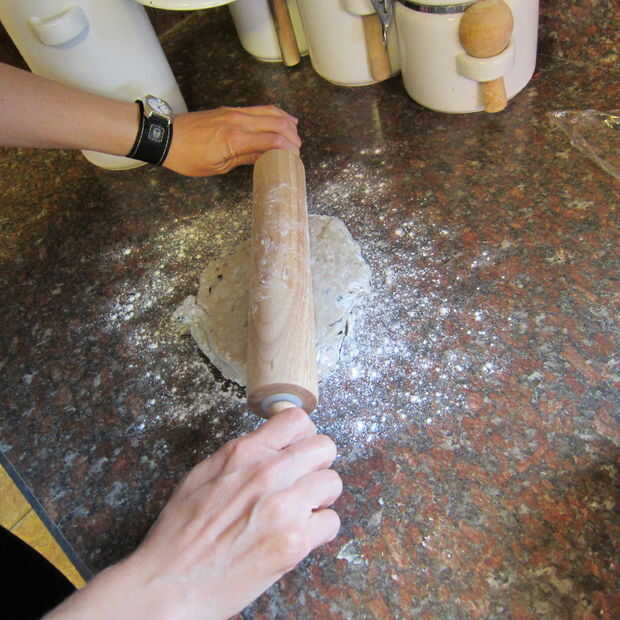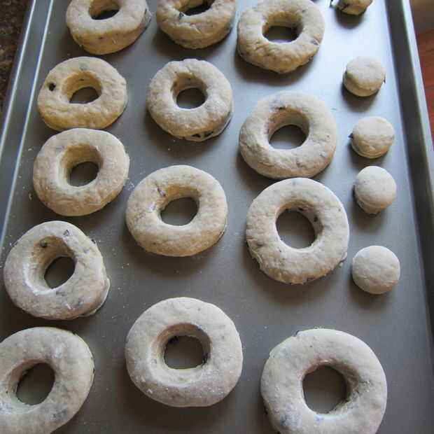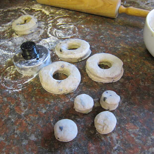 Mientras se está calentando el aceite Retire la masa del buñuelo de la nevera. Sobre una superficie enharinada enrolle la masa a 3/4 de pulgada de espesor usando un perno de balanceo. Usando un cortador de donuts (dunked en harina) corta tantas rondas y se puede. Si no tienes un cortador de donuts puede utilizar un cortador de galletas o un cortador de galletas y un cortador más pequeño de algún tipo para hacer el agujero - quizás el borde de un vaso pequeño. No necesitan ser círculos perfectos, fritura va a cambiar que de todos modos!! Transferencia se redondea a una placa para horno.