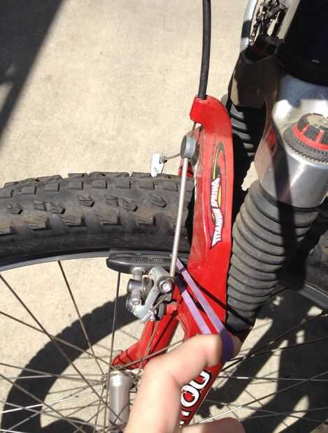 2. Losen la tuerca trasera muy ligeramente la almohadilla de freno apenas se mueve y poner una banda elástica alrededor de la parte posterior de la almohadilla de freno. Tirar de la goma hacia fuera (véase el cuadro) hasta que la parte delantera se inclina levemente en. Puede que necesite a losen la tuerca un poco más si esto no funciona la primera vez. También puede utilizar dos bandas de caucho para obtener más fuerza.