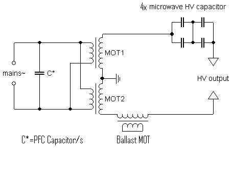 Paso 5) la salida de cableado. Primero necesita identificar los devanados secundarios, el secundario es obviamente que no es principal ya que hay sólo dos bobinas. su conseguido alambre más fino y es mucha. Hay dos partes a él. el alto voltaje que es una conexión de terminal pala solo en un lado o el otro. y luego de tierra que esté conectado a tierra a la base metálica del transformador sí mismo. así que si usted enciende un MOT y conecta el transformador del voltaje conexión arco. Bueno ahora Conecte uno de la pala de una MOT y conecte a la base de la próxima ITV, esto los pone en serie por consiguiente la alta tensión de una le arco en el núcleo del transformador de la otra.