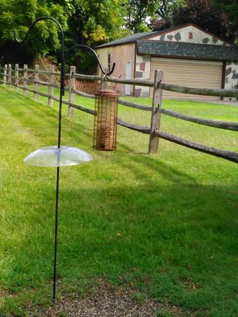 Una manera rápida, fácil y relativamente barata para burlar a las ardillas de llegar a su comedero. Lo que usted necesita: algún tipo de poste (yo usé el cayado de un pastor), un deflector de cúpula (bastante barato en Lowes o Home Depot) y una abrazadera atado al poste bajo el deflector de la cúpula (utilicé una abrazadera del extremo de una barra). Voila! La pinza se fija al poste pero la cúpula se basa simplemente en la pinza por lo que cuando se tratan de las ardillas que en la parte superior, las rocas de la cúpula y las ardillas no tienen nada sólido para agarrar a. Vi algo parecido en una tienda de aves venta $26,00. Creo que probablemente gasté $12,00.
