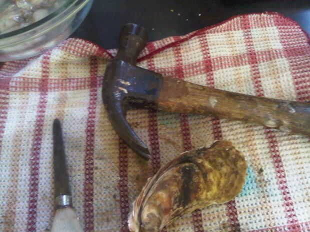 No soy un experto en cómo se hace pero suficiente para obtener sin lesión he desconchados. Que se necesitan un cuchillo de la ostra, un trapo viejo de plato y tal vez un martillo para los más difíciles.