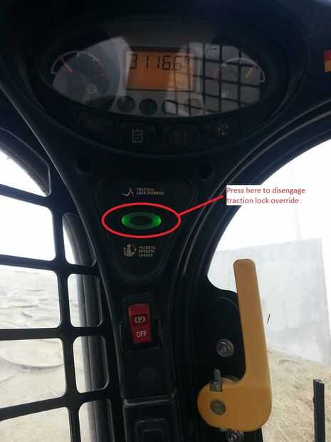 Proceder a desenganchar la anulación de bloqueo de tracción empujando el botón verde situado en la esquina superior izquierda de la cabina. (Ver la foto de arriba para la situación de bloqueo de tracción anular.)