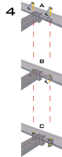ADVERTENCIA: Mientras que intenta conseguir los pines de conexión se deslice a través, esto podría resultar en deslizamiento accidental, por lo tanto causando el puente conector al colapso. Esto puede resultar en lesión del pie, por lo tanto es fundamental el calzado adecuado de desgaste.
