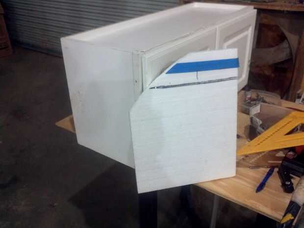 Apenas llego a tener algo de chatarra útil de espuma de poliestireno. Esto se hizo para una plantilla de fácil ya que era muy fácil de cortar a la forma. Utilice su línea de techo para encontrar la forma que usted tendrá que cortar sus gabinetes.