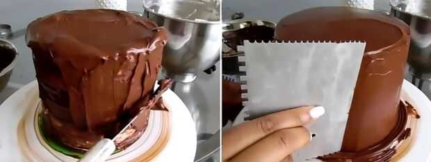Después de que el pastel ha enfriado la capa de ganache debe ser más gruesa. Ahora aplique una segunda capa de ganache. Se pondrá sucio, pero el objetivo aquí es conseguir un montón de ganache sobre la torta y retirar el exceso. A ello plopping una gran cantidad en la parte superior y derribar los lados con un cuchillo. Use el raspador de banco ir alrededor de la torta y crear caras lisas. Movimientos rápidos, raspe cualquier extra de la parte superior.