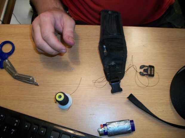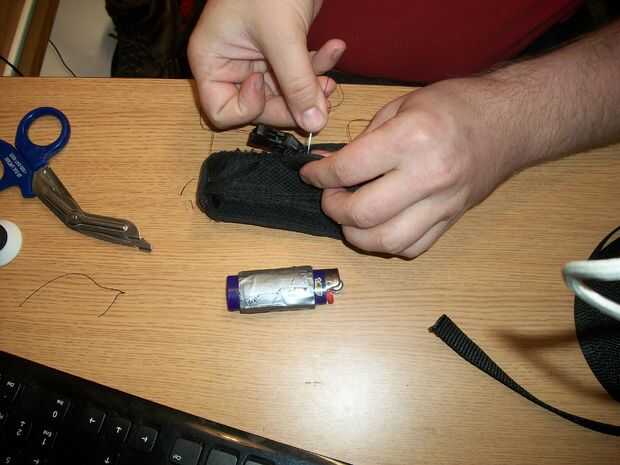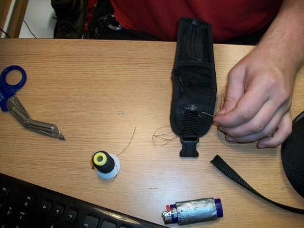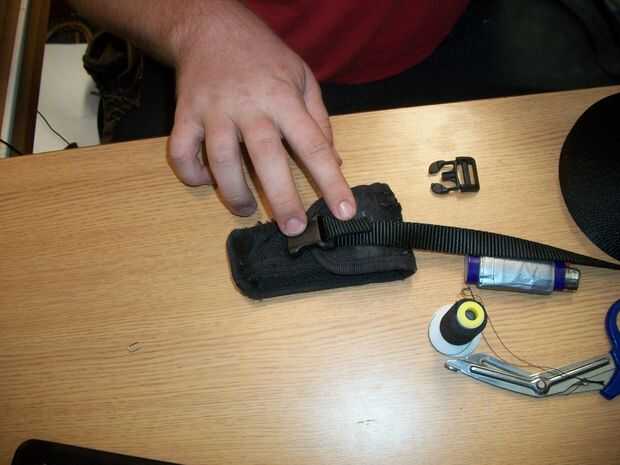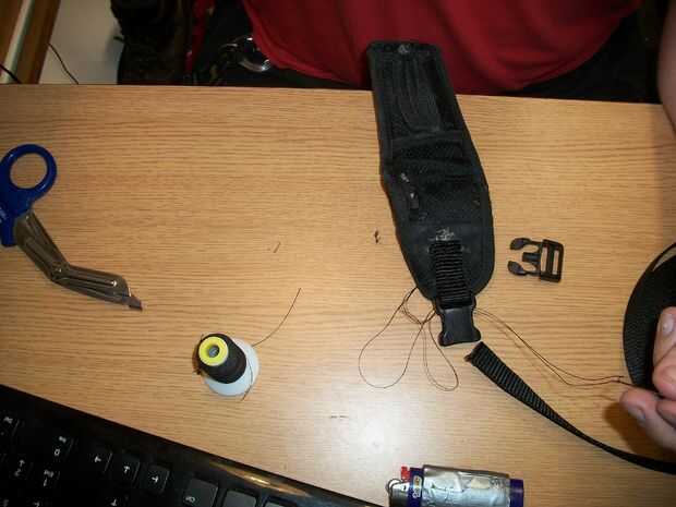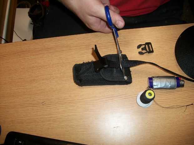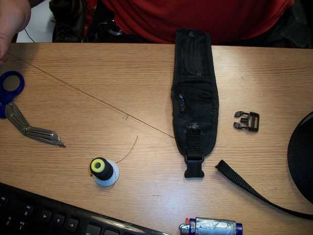 Lo primero es colocar la cinta para el conector hembra en la solapa de la bolsa. el conector hembra no es ajustable, por lo que para que quepa bastante cómodamente. Tengo mi conector colgando hacia abajo de la aleta, mi pensamiento es que habrá un poco más espacio para los dedos presionar la hebilla
