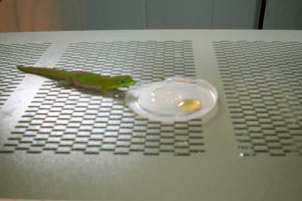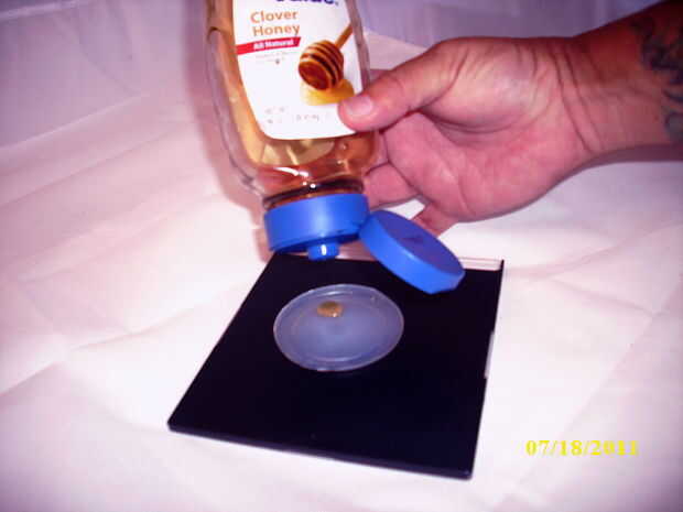 En segundo lugar. Colocar una pequeña cantidad de miel en un plato bajo para atraerlos. Utilicé una tapa de plástico tupperware. (Colocó en una caja de CD para el contraste cuando tomé la foto, para que sea más fácil de ver en la foto.)