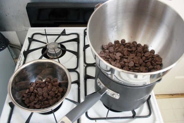 Utilizando obleas de chocolate o chocolate picaditas, reservar una cuarta parte de la cantidad de chocolate en un recipiente separado para usar como una "semilla" más adelante.