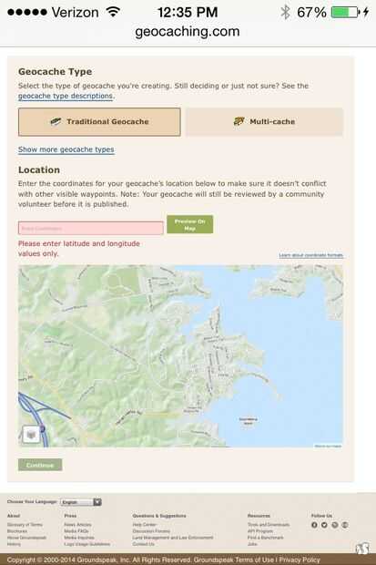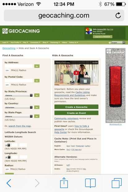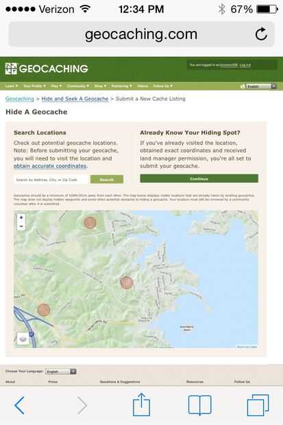 Que desea ocultar un caché tendrá que seleccionar un contenedor. Si quieres uno pequeño debe montar una pieza de papel. Si quiere ser grande debe encajar un pequeño cuaderno y algunos premios. En la memoria caché debe tener una etiqueta con el nombre de memoria caché, su geocode(assigned later), su nombre de usuario y su información de contacto. Encuentre un lugar para la memoria caché y copie las coordenadas de su teléfono usando una app o el GPS. Entonces llene el formulario para publicarlo. Debe tomar una o dos semanas antes de su publicación en línea.