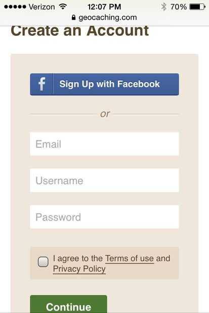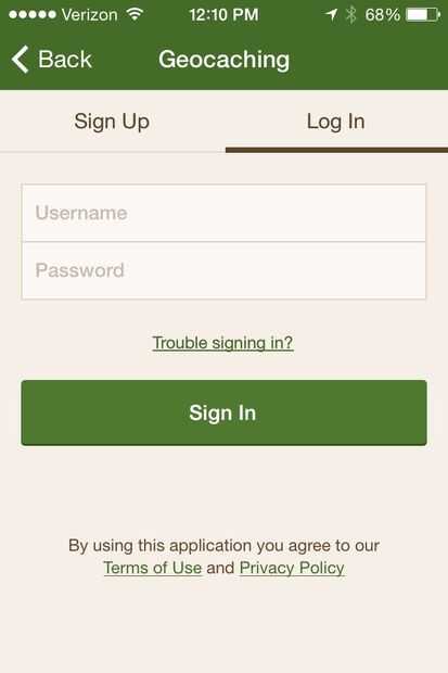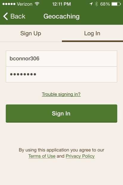 ** Esto es para un teléfono ** usted entonces necesitará iniciar sesión en la aplicación y le dará una advertencia. (Ver aviso legal arriba) Seleccione Aceptar y luego llegará a la pantalla de menú. Luego se seleccione encontrar geocachés cercano y seleccione un geocaché de la lista.