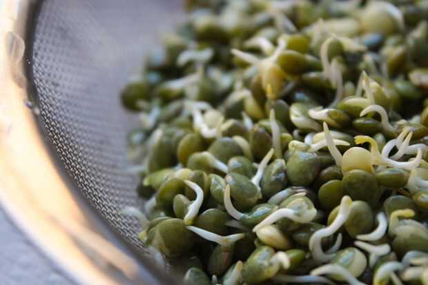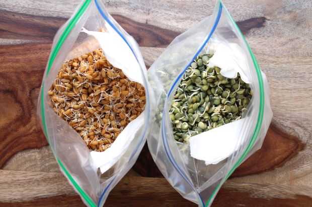 Brotan una gran variedad de cereales y leguminosas (legumbres) para nuestras palomas de cola de Milano. Aquí nos estamos surgimiento orgánico mezclado grano (triticale, trigo, guisantes y veza) comprado directamente en una lechería orgánica y mixta g
