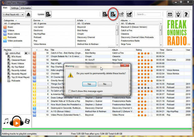 Fácilmente puede eliminar cualquier canción o pista de vídeo de tu iDevice por seleccionar una o más pistas y haciendo clic en el botón eliminar como se indica en la imagen.