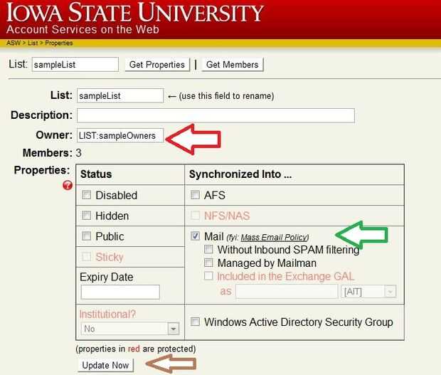 Por último, si sólo va a crear una lista o por alguna razón quiere deshabilitar la capacidad de correo de la lista, simplemente hacerlo modificando la casilla junto a "Correo" "Sincronizada en..." (la flecha verde en la imagen). Tenga en cuenta que los cambios en el estado del correo, como cambios en la membresía, pueden tomar poco tiempo para ir a afectar. Haga clic en "Actualizar ahora" para guardar los cambios.