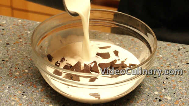 Verter la crema sobre el chocolate. Dejar reposar un minuto. Revuelva suavemente hasta que se derritan. Deje que la ganache fría antes de verterla sobre una torta.