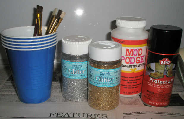 He utilizado un par de cuñas que compré a la venta en Payless. Me gustó mucho el estilo del zapato pero eran púrpura, un color que no coincida con nada actualmente tengo en mi armario. Así, estos zapatos fueron un gran candidato para este proyecto. Se puede utilizar cualquier tipo de zapato, nuevos o viejos, cordones o sin cordones. Una cosa en cuenta: el brillo es más inclinado a tomar sobre una superficie con textura como una zapatilla de lona o tela en lugar de un zapato suave y brillante. Todavía puede utilizar el último tipo de zapato, pero esto puede requerir que hagas más capas de brillo para obtener el nivel de cobertura que desea.