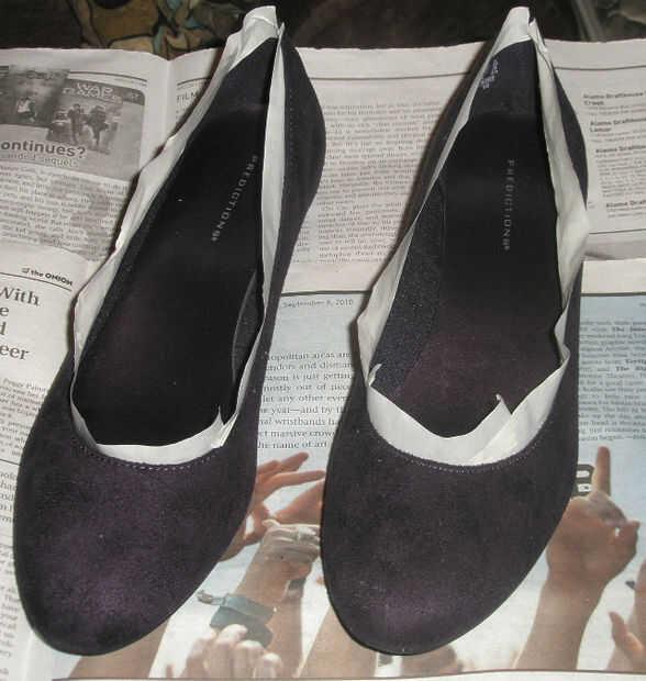 recomiendo encarecidamente usar conducto de cinta a cinta de cualquier parte de su zapato que no desea pintar accidentalmente.  Si está usando un zapato con cordones, quitar los cordones y la cinta sobre los orificios de encaje para evitar cualquier pegamento de conseguir pegado en su interior.  Si la zapatilla tiene algún tipo de adorno como una flor o la colmena y no desea que brillo en él, cinta sobre él.