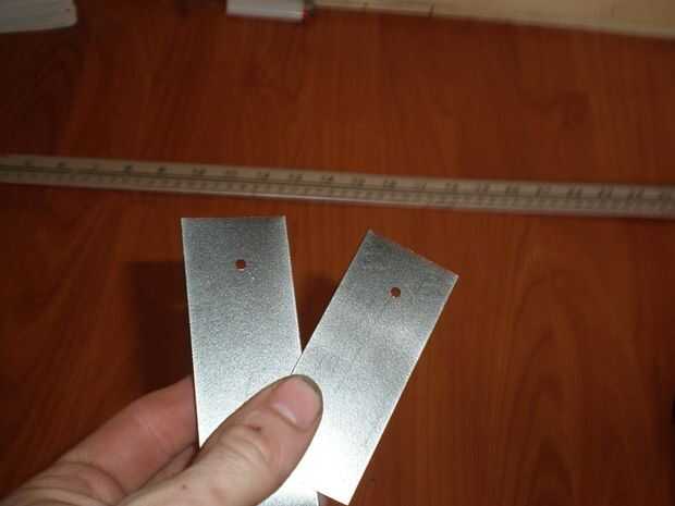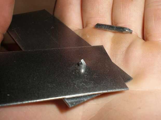 ¿Recuerdas esos 2 pedazos de metal? pues ahora es el momento de golpe/perfore un orificio en ambos. ya que es práctica no importa donde, como hay 1 orificio en cada pieza.