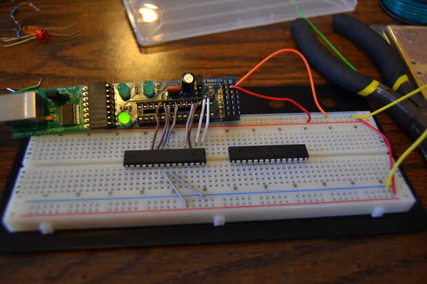 En primer lugar, tomar el ATmega328 con el gestor de arranque, lugar en el tablero de pan, con el semicírculo a la derecha. (También Asegúrese que los lados de la IC en partes separadas de la Junta de pan, o corta hacia fuera.-mina se separa por la mitad.)
