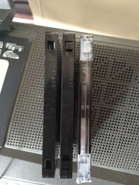 Ahora a la grabación. Cuando usted tiene una cinta para grabar, asegúrese primero que las orejetas de protección contra escritura están presentes o los agujeros están cubiertos, esto le permite grabar en una cinta. Se muestra más arriba son tres cassettes, un tipo con las lengüetas empujé en un tipo II con las lengüetas de presente, y un tipo I con los orificios con cinta sobre.