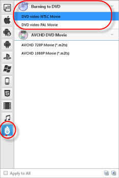 Favor de abrir Perfil de salida, elija grabación a DVD de la lista y elija DVD video NTSC pelicula o DVD video PAL película según su sistema de TV.