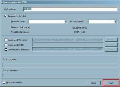 Presionando el botón "grabar" bajo el menú "Archivos" y ver un cuadro de diálogo donde puede elegir generar carpeta DVD, generará archivos ISO y el directorio temp personalizado etc.. Entonces puede empezar la quemadura haciendo clic en el botón "start" dentro de este cuadro.