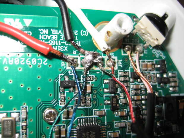 Canal derecho cable de jack de 3,5 mm (rojo en este caso) R + conjunto, el cable del canal izquierdo (blanco en este caso) a L + común y el cable de tierra común (negro en este caso) tanto el medio R y L juntas de soldadura.  Estas son muy pequeña soldadura juntas así que tenga cuidado de no aplicar demasiado calor.