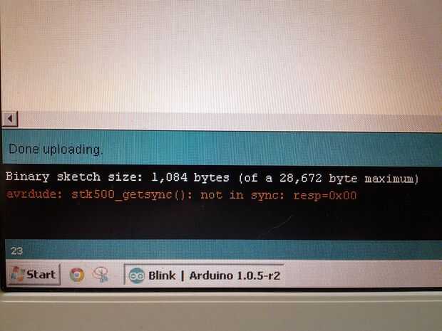 Usted probablemente recibirá el error en la segunda foto. Esto no tiene nada que ver con el código está bien/mal. Simplemente significa que su computadora y la Junta no comunica correctamente, en nuestro caso la falta del gestor de arranque nos impide hacerlo.