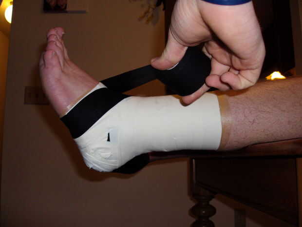 3. lentamente desenrolla la cinta alrededor del tobillo, manteniendo un ángulo de 45 grados. Usted debe terminar hacia en la parte inferior del pie