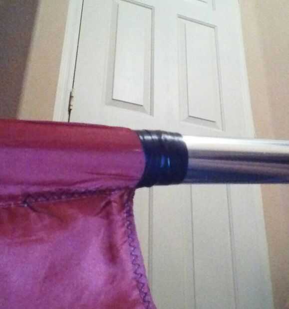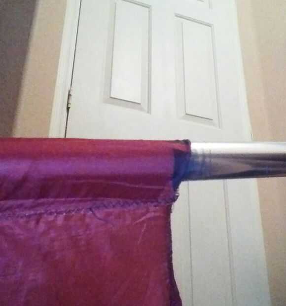 Asegúrese que la costura aquí directamente en línea con el posicionamiento de la costura en la parte superior. En otras palabras, no tienen la costura todo torcido alrededor del polo, que bandera no girará correctamente si esto es así. Estirar la seda ligeramente por el palo, para que la bandera no es todo Cruncheando para arriba. Entonces, como antes, pellizcar la costura y luego ir alrededor de la circunferencia del poste y seda una vez o dos veces. Y otra vez, asegúrese de que la bandera está realmente colocada en el poste y que simplemente no añadir alguna cinta a la seda.