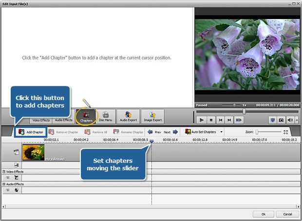 En caso de convertir sus archivos en un formato de DVD, el programa te permitirá crear un menú DVD que podría navegar por tu disco de usarlo fácilmente. En primer lugar usted necesita establecer los capítulos de su menú de DVD. Para cambiar en el modo de edición utilizando el botón Editar en la Barra de herramientas principaldel AVS Video Converter. En la ventana abierta pulse el botón central de capítulos .