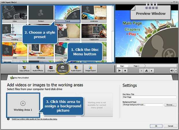 Seleccione uno de los estilos de Menú de disco por doble clic en él o seleccionar la opción de Aplicar el estilo de menú en el menú contextual. Cambiar entre la Portada y la página de capítulos en el área de previsualización . Para asignar su propio fondo fotos haga clic en las Áreas de trabajo (si están disponibles para el estilo de menú seleccionado) en la parte inferior de la ventana Editar archivo (s) de entrada , seleccione el archivo de vídeo o imagen que desee en la ventana abierta y pulse el botón abrir .