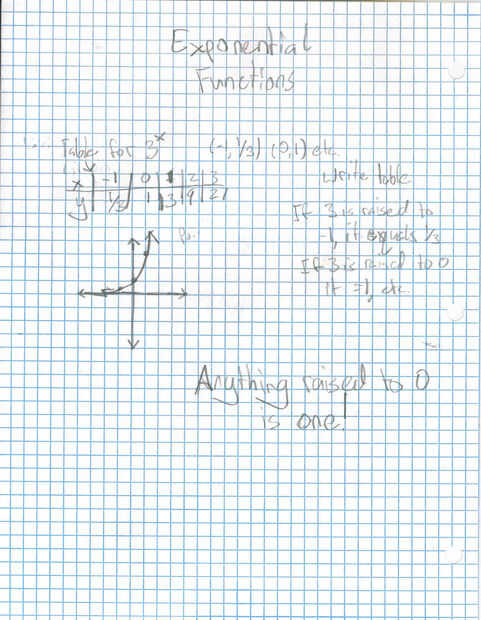 Para ver, necesita hacer una tabla del exponente y es posibles soluciones número. Por ejemplo, si 3x y = 1, la respuesta es 3, pero si X =-1, la respuesta es 1/3, nada a la potencia cero es uno. Por lo tanto, /on el eje X, ver lo que es igual X, - 1,0,1,2, etc.. En el eje Y, para obtener lo que el número elevado a lo que X es igual a igual y ver los puntos, por ejemplo. (-1, 1/3) (0,1) (1,3) (2,9) (3,27). Luego conectar estos puntos, y forma una curva. Funciones exponenciales aumente o disminuya rápidamente.