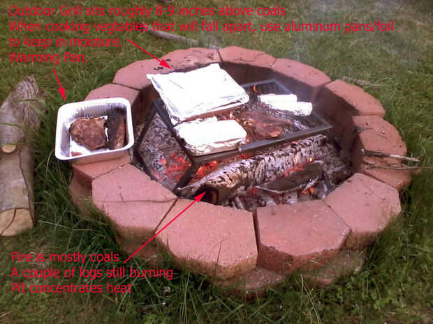 cocido/demasiado, es una buena idea utilizar las ollas de cocinar de aluminio reciclable y papel de aluminio que fueron rociados con aceite de oliva un poco antes de su uso. También es una buena idea tener una de esas sartenes disponibles como una bandeja de calentamiento y recepción para los artículos que ya estén cocidos, pero deben mantenerse calientes hasta que el resto de los alimentos listo para comer. El intenso calor del fuego no es probable que le permitirá tener un montón de elementos individuales como rebanadas de verduras etc. a más (las manos se quemará si se intenta hacer demasiadas cosas). Que encierra la parte superior de estas bandejas con papel de aluminio ayuda a mantener el calor y la humedad en el envase, que ayuda a mantener las verduras de la quema y reduce/elimina la necesidad de voltear las cosas, que se quema las manos. Por favor recicle estos bandejas 'desechables' cuando se hace la comida.