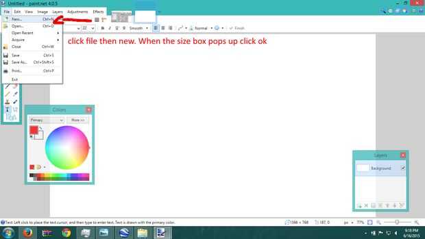 Cuando se abre el paint.net, haga clic en archivo y luego haga clic en nuevo