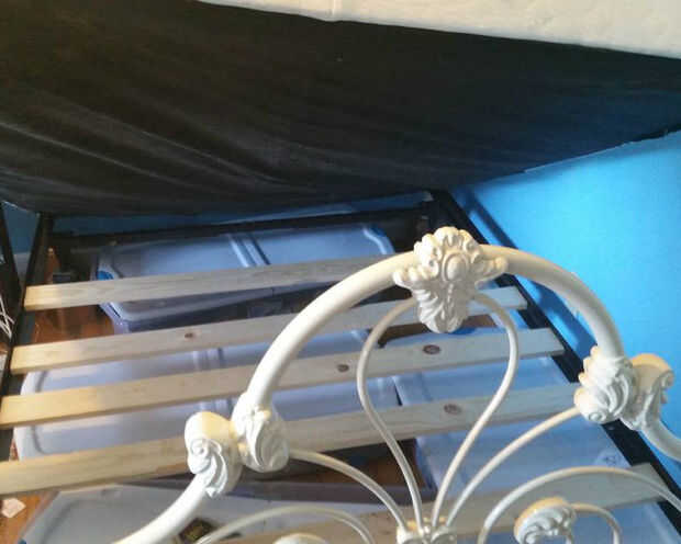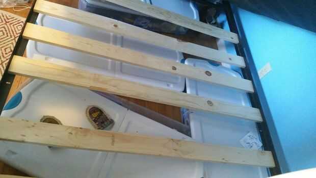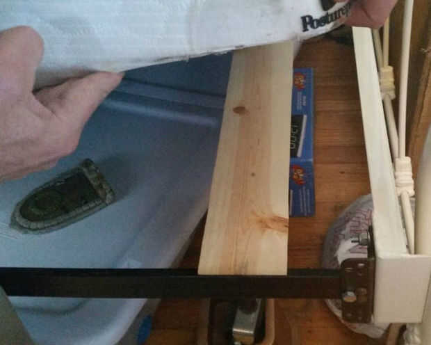 Esta es la parte principal que necesitaba ayuda! Levante el colchón y somier y coloque los listones de aproximadamente espaciados uniformemente que abarca el marco de la cama. Asegúrese de que están asegurados y luego suavemente como sea posible, bajan el somier y el colchón hacia abajo sobre ellos.