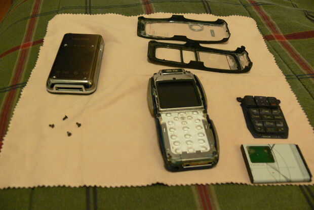 Para mi reproductor de MP3, están desatornillando los tornillos de la placa de respaldo. De mi teléfono, las placas frontales, teclado y batería (que ya debería estar fuera, si estaban siguiendo a lo largo). Poner todas las piezas pequeñas en un plato o un lugar seguro para que no ruede lejos o se pierden.