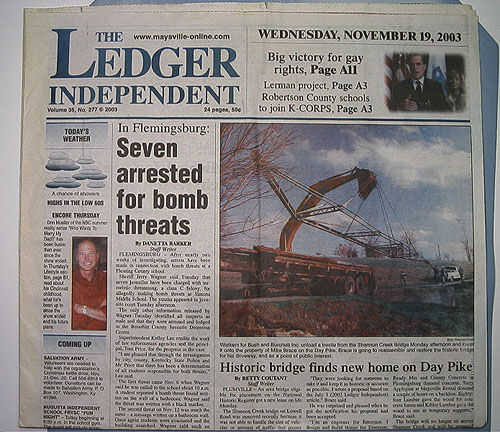 Tomé un antes y después de la imagen del sitio original después de tomar el puente hacia fuera. Wow... Qué lío! Aquí (también) es la primera página del periódico local, mostrando la caída. Ahora tuve mis 15 minutos de fama, justo al lado de allí con nuestra propia versión local de la tripulación del bombardero de la Uni!... ¡ Genial!