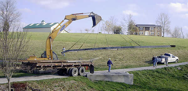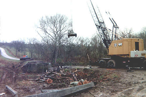 Así que el siguiente paso es simple: hacerles saber donde y cómo entregarlo. Ahora es su puente, así que les digo en qué condición que quieras en. Pedí que (si pudieran) recoger en una pieza (cubierta y todo) y dejarlo caer sobre mis pilares, sigue intacta, pero dijeron que "No puede hacer". Como explicaron, podrian haber hecho él esa manera pero que necesita ser tomado hacia fuera en dos pasos, como era un poco demasiado larga y ancha para hacer algunas de las esquinas afiladas en una sola pieza. Entonces dije que la única estipulación que debía aceptar este puente era que el movimiento equipo podría no desarmar las cerchas , que estaba caliente-clavada y no iría detrás juntos otra vez. Estaban de acuerdo, por lo que cayeron apagado intactos.