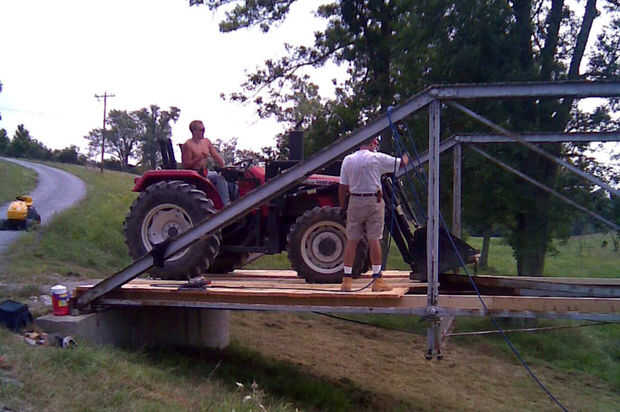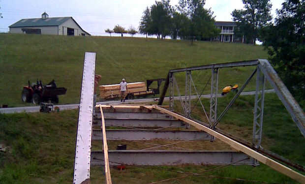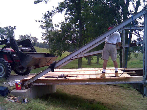 Nota del editor: la cubierta original no-vigas de acero debajo de la cubierta (junto a los corredores bosques), pero estas vigas probablemente habían puestas debajo de la cubierta cuando buggies dieron paso a pastillas así que decidí usarlos así. Durante la reconstrucción que también observé lo mal que dañen el hecho a mano [hierro] Cruz vigas que dependía, por lo que cuando me los puse pongo algunos material de la correa transportadora de cut-up que había recogido en el encuentro de intercambio local (muchos agricultores utilizarlos en animales puestos como suelo sobre el duro piso de concreto) entre ellos y vigas de la Cruz. Esto detendría cualquier destrucción adicional de las piezas originales del puente.