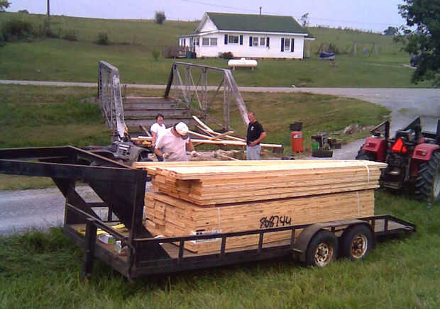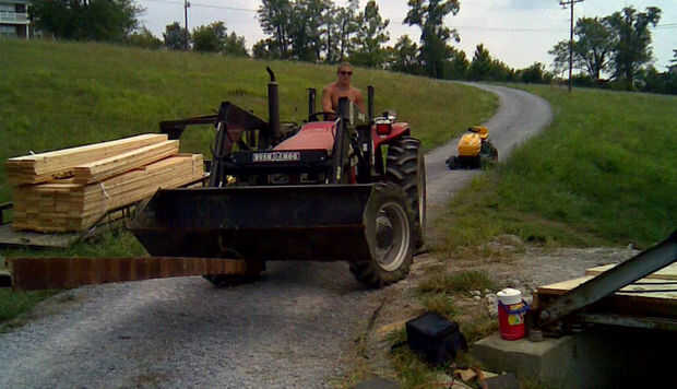 Una vez que las vigas fueron abajo [a través de las vigas transversales] hemos establecido los corredores y entonces clavó hacia abajo de las tablas de 14' a través de ellas para mantenerlas en su lugar.