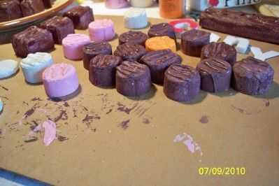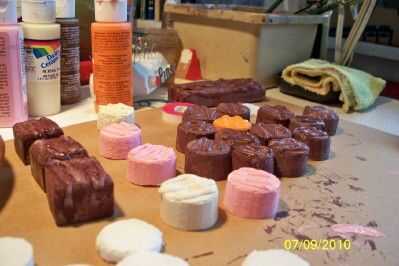 Tenía un color de llama, de todas las cosas: barra de chocolate. Intentó aclarar algunas piezas, pero decidió que no era necesario. Otros colores de marrón, algunos blanco y algún color de rosa se utilizan para asemejarse a colores caramelo real. Los molinetes de caramelos usa rojo y verde, y el maíz de caramelo se pinta como se muestra.