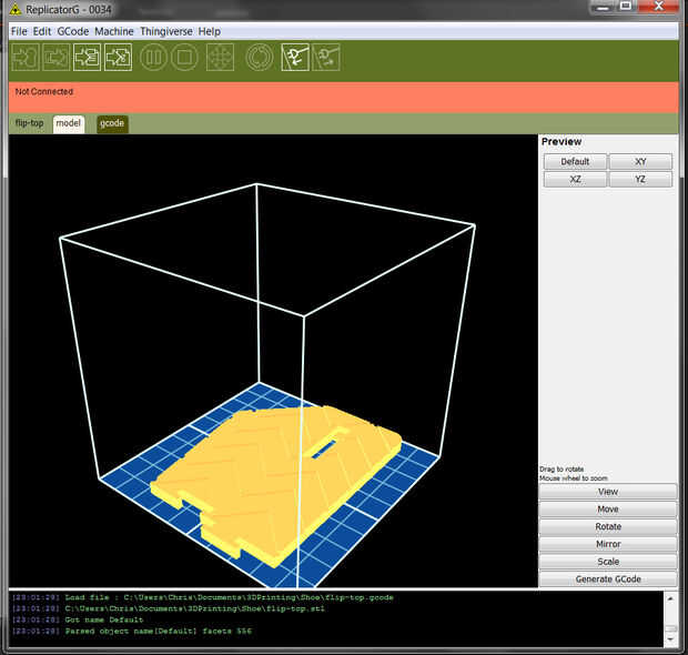 Después de exportar los archivos STL, abrirlos en tu programa de impresión 3D (e.g. ReplicatorG). La parte superior de la sandalia debe ser cara, por lo que no hay voladizos (imagen 1). Que no es el caso, la vuelta a su modelo. Por ejemplo, en ReplicatorG, haga clic en "Girar" y luego un par de clics del botón de "+ X" debe voltear el modelo. Luego hacer "Lay Flat".