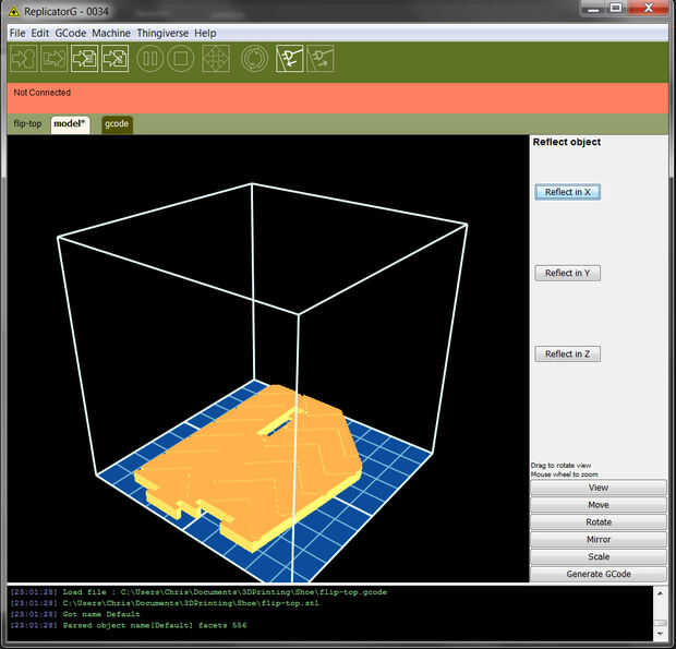 En este momento sólo hemos hecho un pie, pero la segunda es simplemente un espejo de la primera, así que no realmente lo tiene a CAD para arriba. El CAD o programa de impresión 3D (e.g. ReplicatorG) debe ser capaces de espejo las piezas para usted. Por ejemplo, en ReplicatorG, al ver el modelo, pulse el botón de "Espejo" y "Reflejar en X" (imagen 3). Si no hace lo que se esperaba, intente que deshacer y espejado en un eje diferente (el modelo puede girarse relativo a la mía). Guarde el archivo resultante con un nuevo nombre (y recuerda hacer esto para cada parte si va a imprimir una sandalia de dos partes). Imprimir el otro zapato.