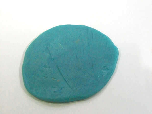 Tomar una arcilla azul. Calentar la arcilla con las manos. Luego aplanar la arcilla. Hacer una forma redonda. (ver imagen 2)