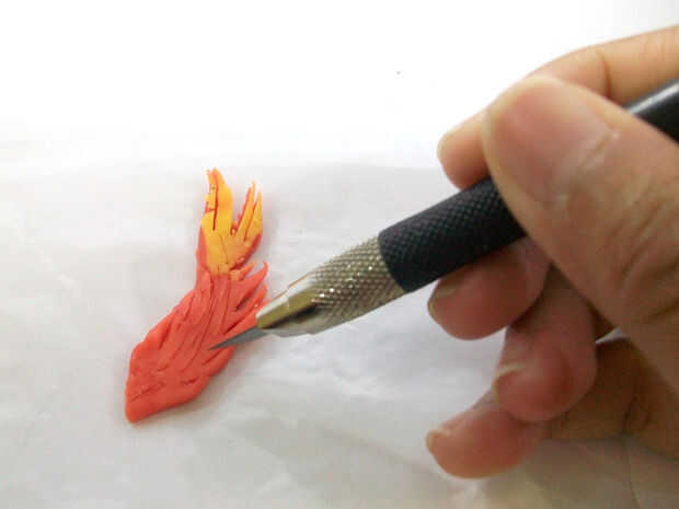 Calentar la arcilla de redrange con las manos. Luego aplanar la arcilla. Poner el logo que cortamos antes en la arcilla. Corte perfectamente con lápiz del cortador y tenga cuidado. Sólo trate de no echar a perder la forma. (ver imagen 1)