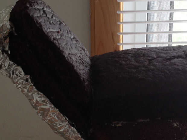Con clavo o tornillo, sujete el cuerpo, cuello y cabeza. Cubrir todo con papel de aluminio o chocolate derretido. La idea es no dejar que el material no comestible a las tortas.